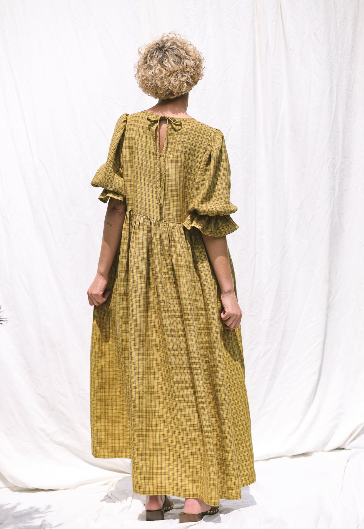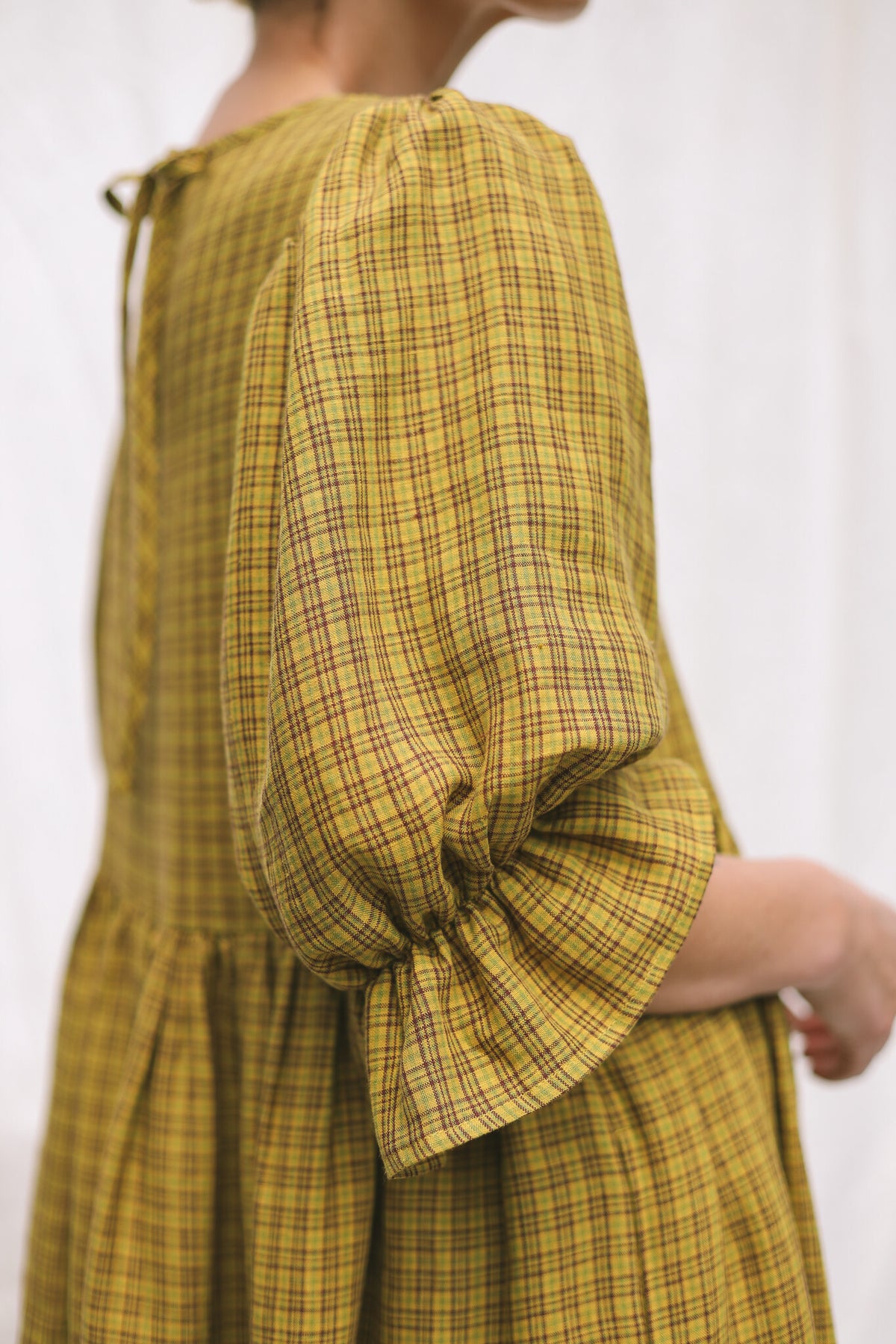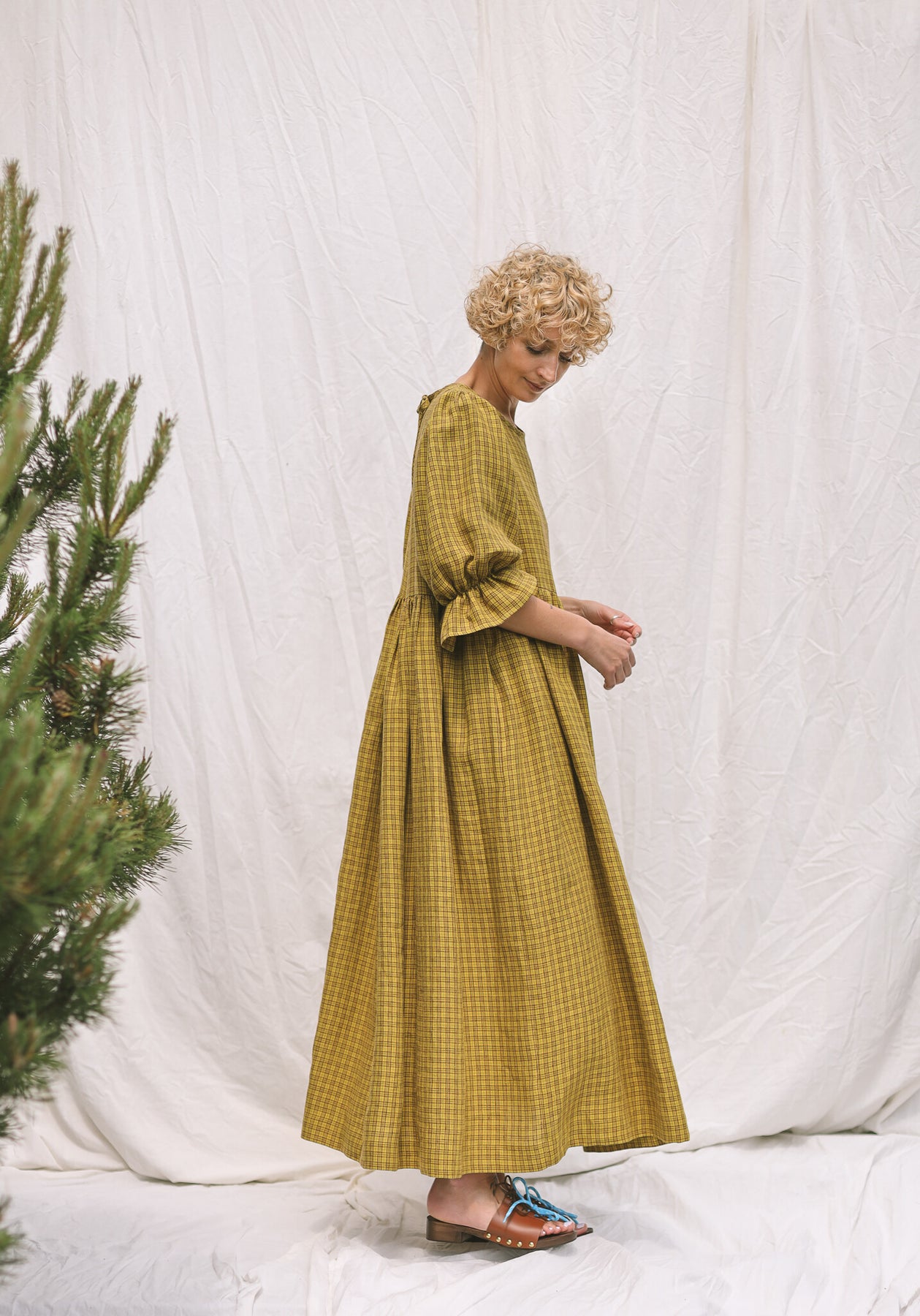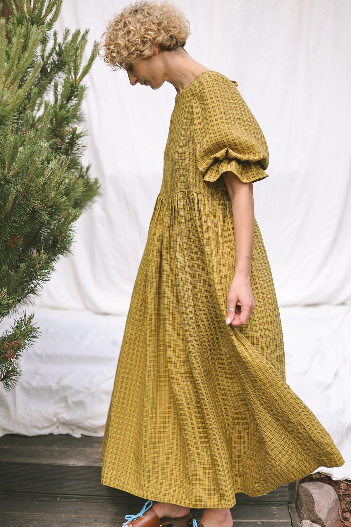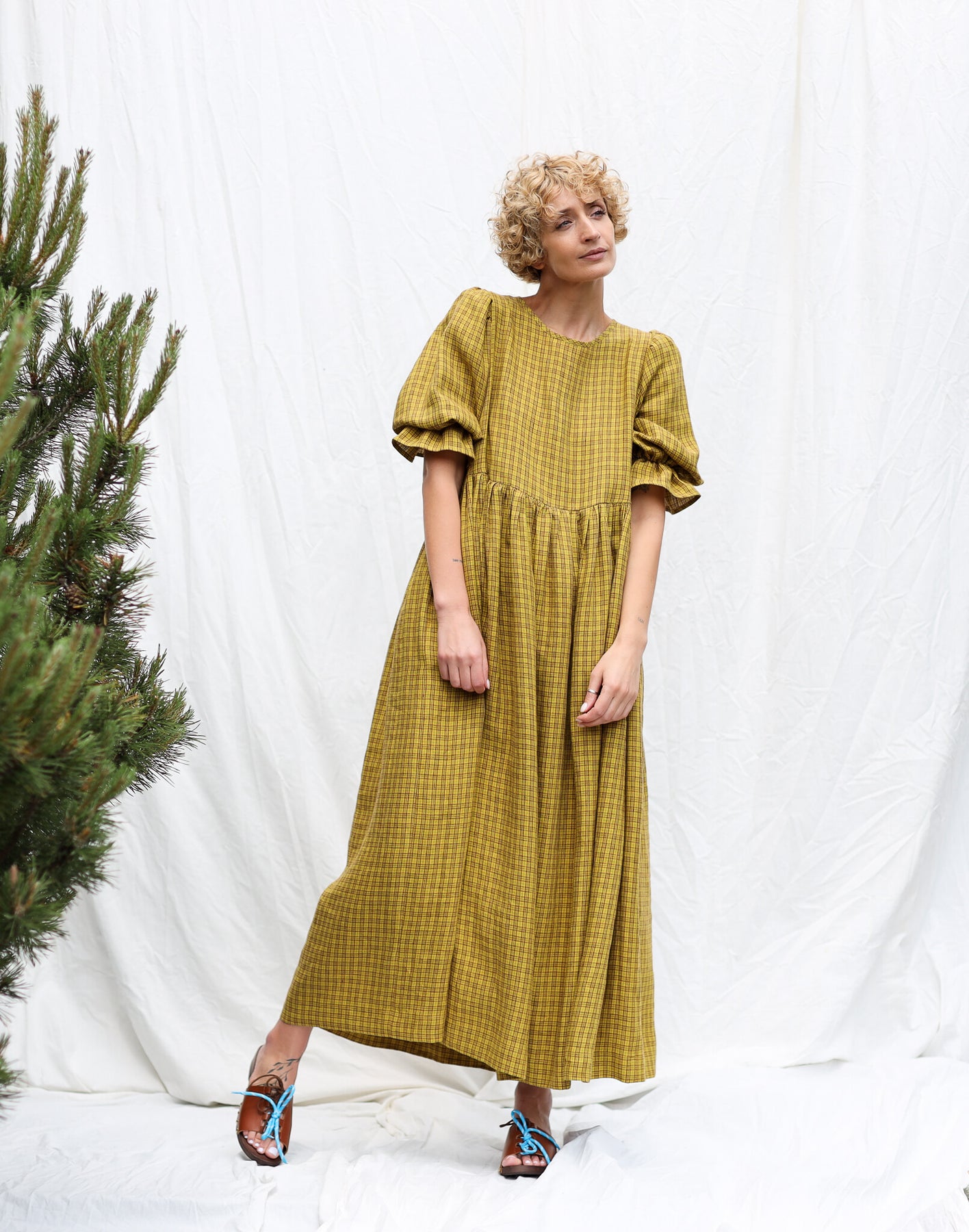 OffOn’s handmade dresses are crafted to order, embracing traditional methods in every stitch. This oversized maxi dress combines comfort with a graceful, feminine look. It features elbow-length puffed sleeves, convenient pockets, and is made from breathable linen. The model, standing 175 cm tall, wears a ‘one-size’