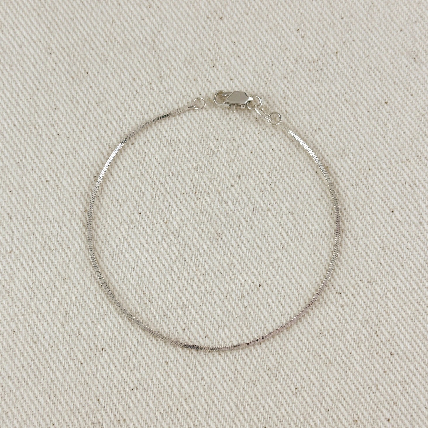 ABOUT : This sleek 1.0mm square herringbone bracelet features interlocking geometric segments that create a smooth, flexible drape around the wrist. Crafted from sterling silver, the square profile adds subtle dimension while maintaining a delicate, refined silhouette. The distinctive herringbone weave catches light beautifully, creating elegant shimmer with every gesture.