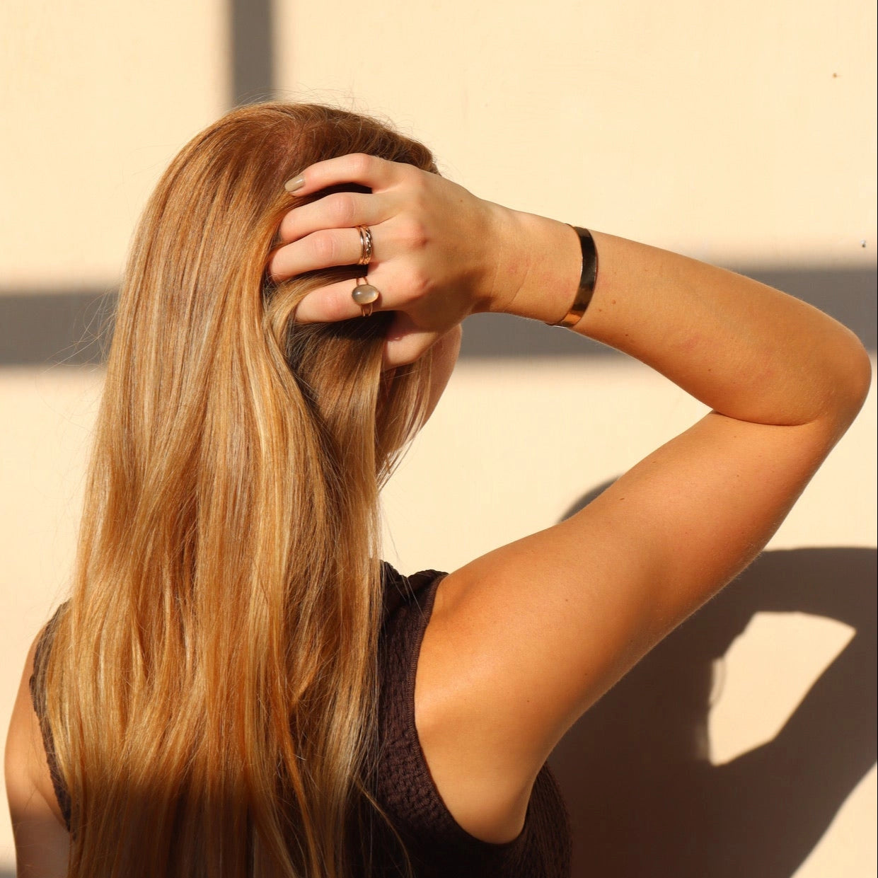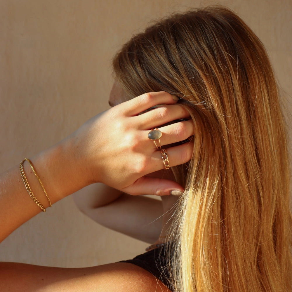 The Ember Ring highlights a large luminous moonstone set in a sleek, modern band. Known for its soft, iridescent glow, the moonstone brings a touch of light to your everyday style. Designed for effortless wear, it’s a statement piece that still feels timeless and understated.