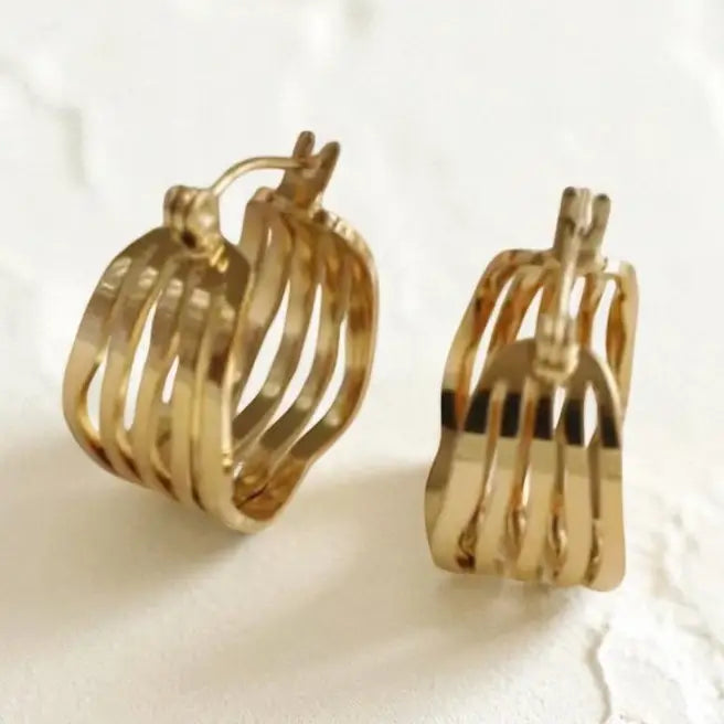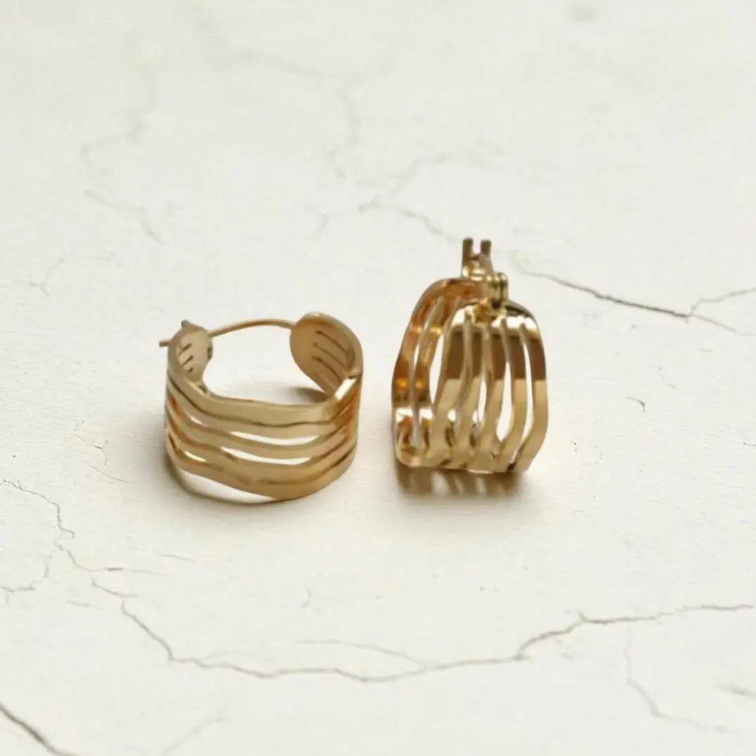 Wavy layers of gold give our Mirage Hoops their sculptural glow… bold, dimensional and the pair you’ll keep reaching for. 18K Gold Plated over Stainless Steel for tarnish-resistant wear
