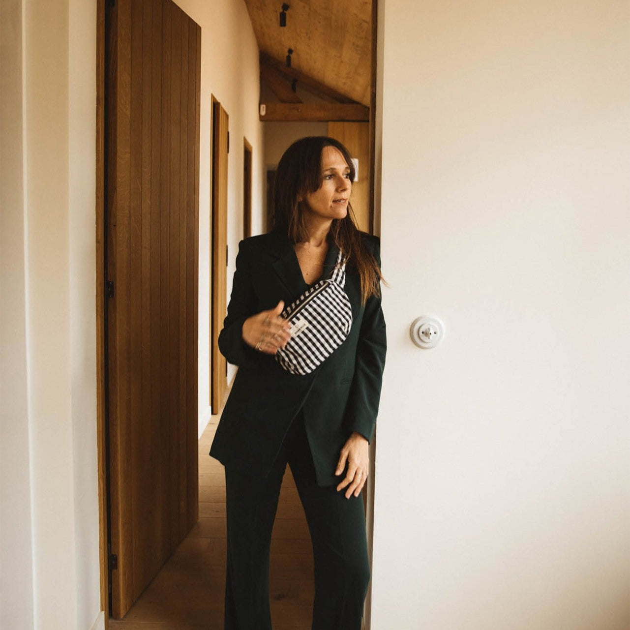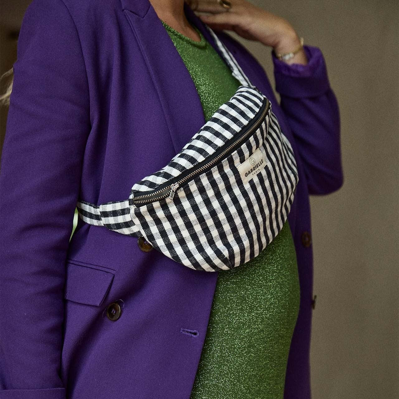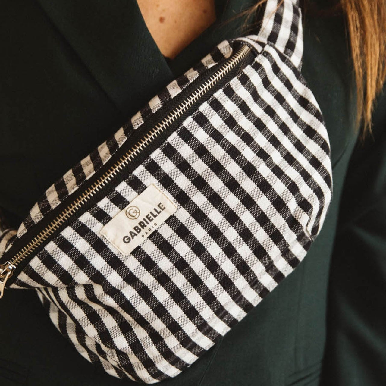 The Vichy Black and White cotton waist bag, featuring a charming pattern and cozy color that fits effortlessly with any outfit. Made from 100% cotton with a soft camel cotton lining, it measures 30 x 15 x 8 cm. The adjustable strap extends from 66 to 110 cm for a comfortable fit. Inside, you'll find a handy pocket, and the bag closes securely with a zipper. Easy to care for, simply machine wash it at 30°C. OEKO-TEX certified and free from AZO class dyes that are known to be harmful to the skin and the environment.
